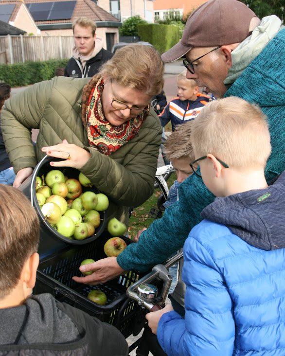 ‘Het gaat vooral om de ervaring. Sommige kinderen weten niet dat een appel van een boom komt; een hele wereld gaat voor hen open. Ik snijd dan een stuk appel af en geef ze een stukje van de verschillende soorten die we hebben. De één bijt er meteen in en de ander is afwachtend, niet bekend met het eten van fruit. Als die dan uiteindelijk toch met veel plezier een appel eet, dan kan mijn wereld niet meer stuk. Er bestaat toch niks mooiers dan dat?! En als de kinderen klaar zijn, nemen ze twee tot drie emmers mee naar school. De klassen krijgen van de diëtist een recept erbij zodat ze gezond leren koken op school zonder dat ze te veel suiker en vetten binnen krijgen. Dan wordt er van alles van gemaakt: appelsap, appeltaart, appelchips. Je kunt het zo gek niet bedenken.’